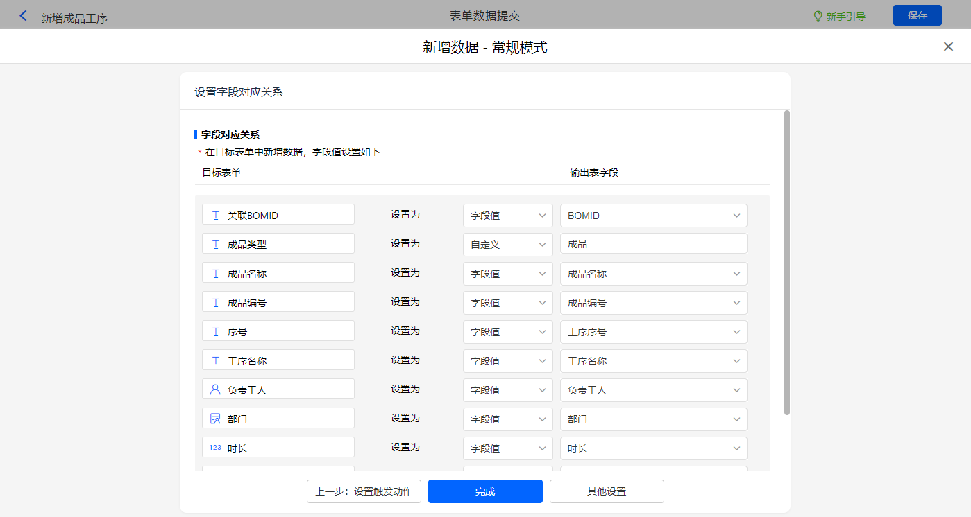 选择目标表单【计划成品辅助表】,设置对应赋值字段,设置好点击【完成】并保存该数据助手;