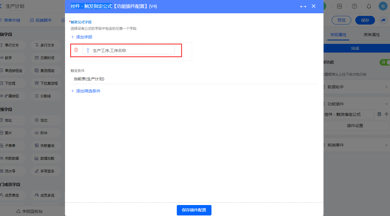设置【控件 - 触发指定公式】的功能插件,如图配置;