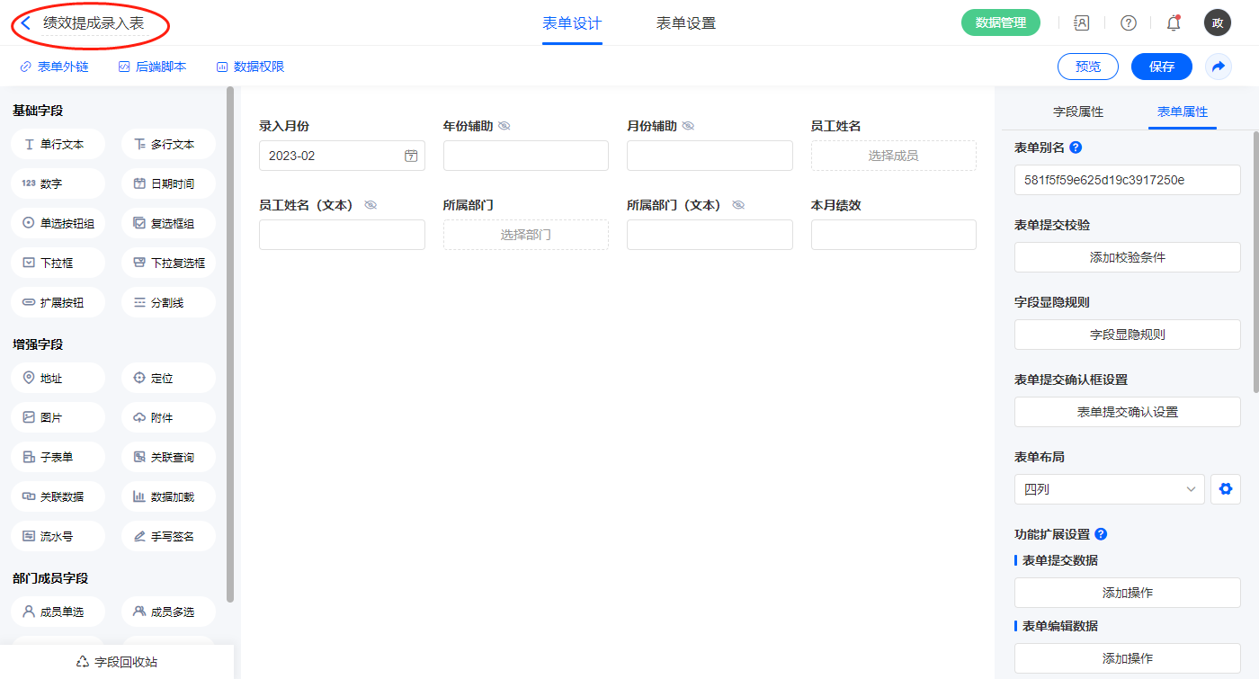 2.4、表单【绩效提成录入表】字段及表单属性设置