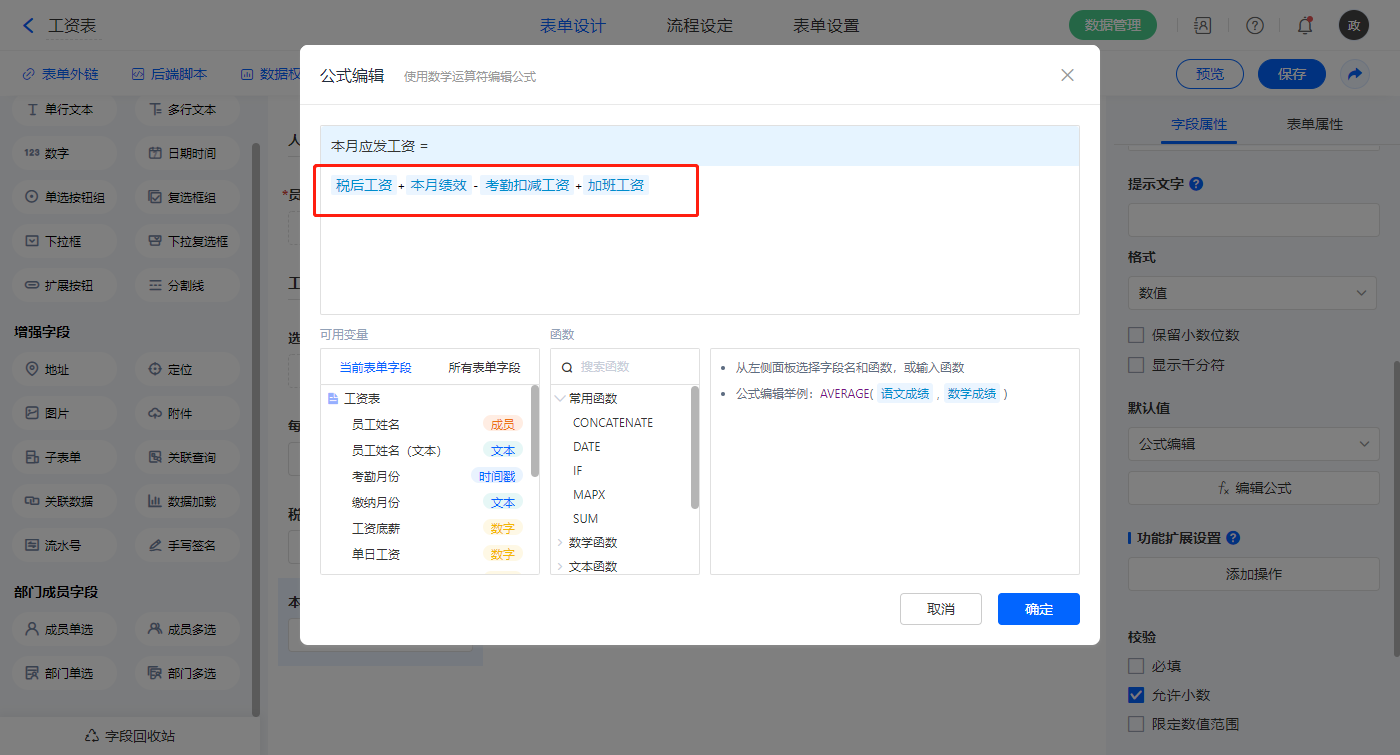 【本月税后实发工资】字段,默认值选择公式编辑,如图设置公式;