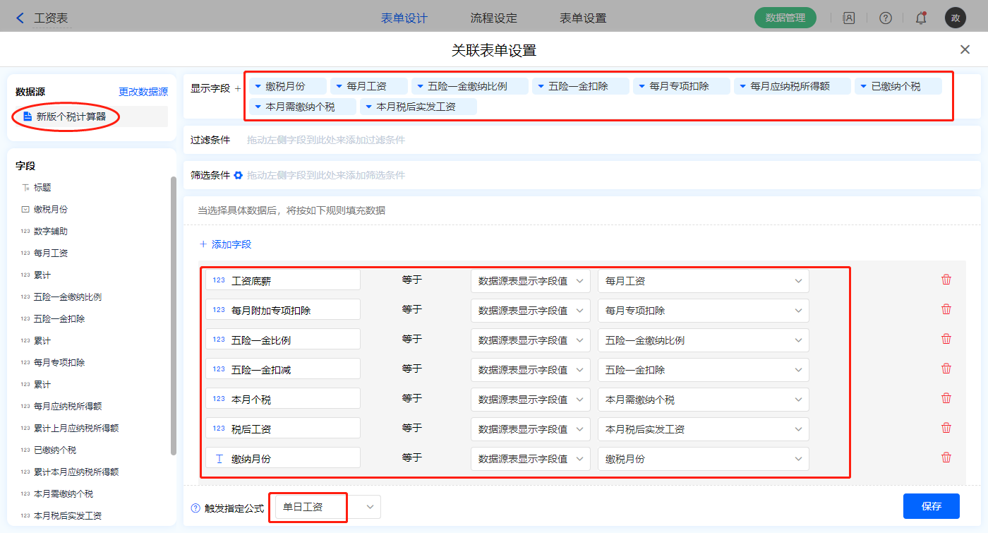 3)【选择员工薪资】数据加载字段,数据源为【新版个税计算器】,添加显示字段设置赋值字段,触发指定公式为【单日工资】字段,设置完点击保存;