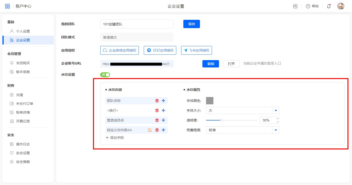 账户中心>>企业设置>>水印设置,开启水印设置。