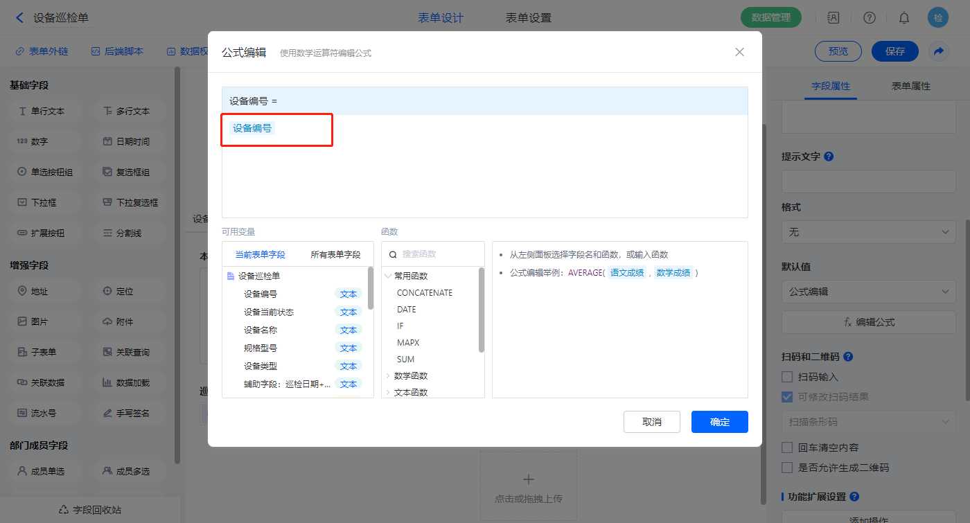 【巡检信息.设备编号】字段,默认值选择公式编辑,如图设置公式;