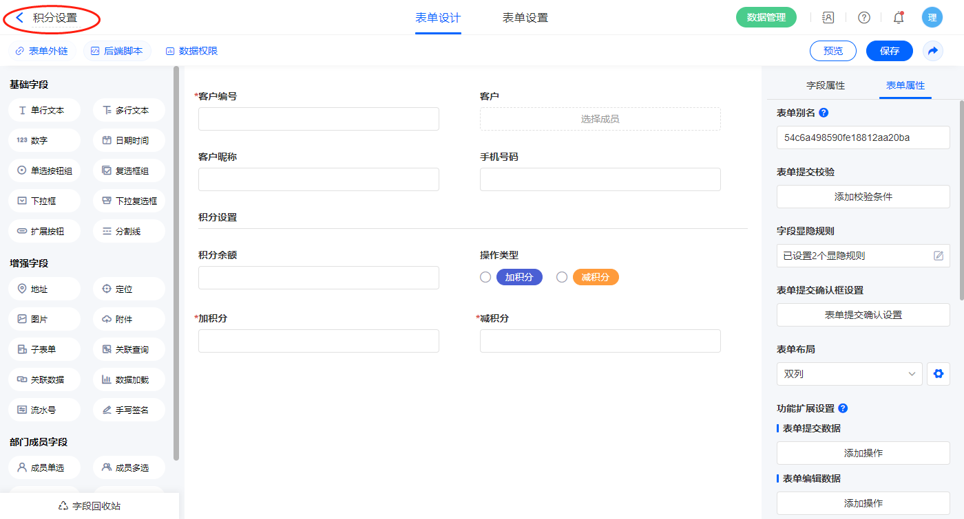 2)设置两条显隐规则,当【操作类型】字段等于加积分显示【加积分】字段,当【操作类型】字段等于减积分显示【减积分】字段;