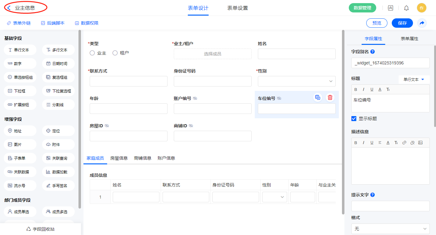 | 业主/租户 | 成员单选 | 房屋ID | 单行文本 |