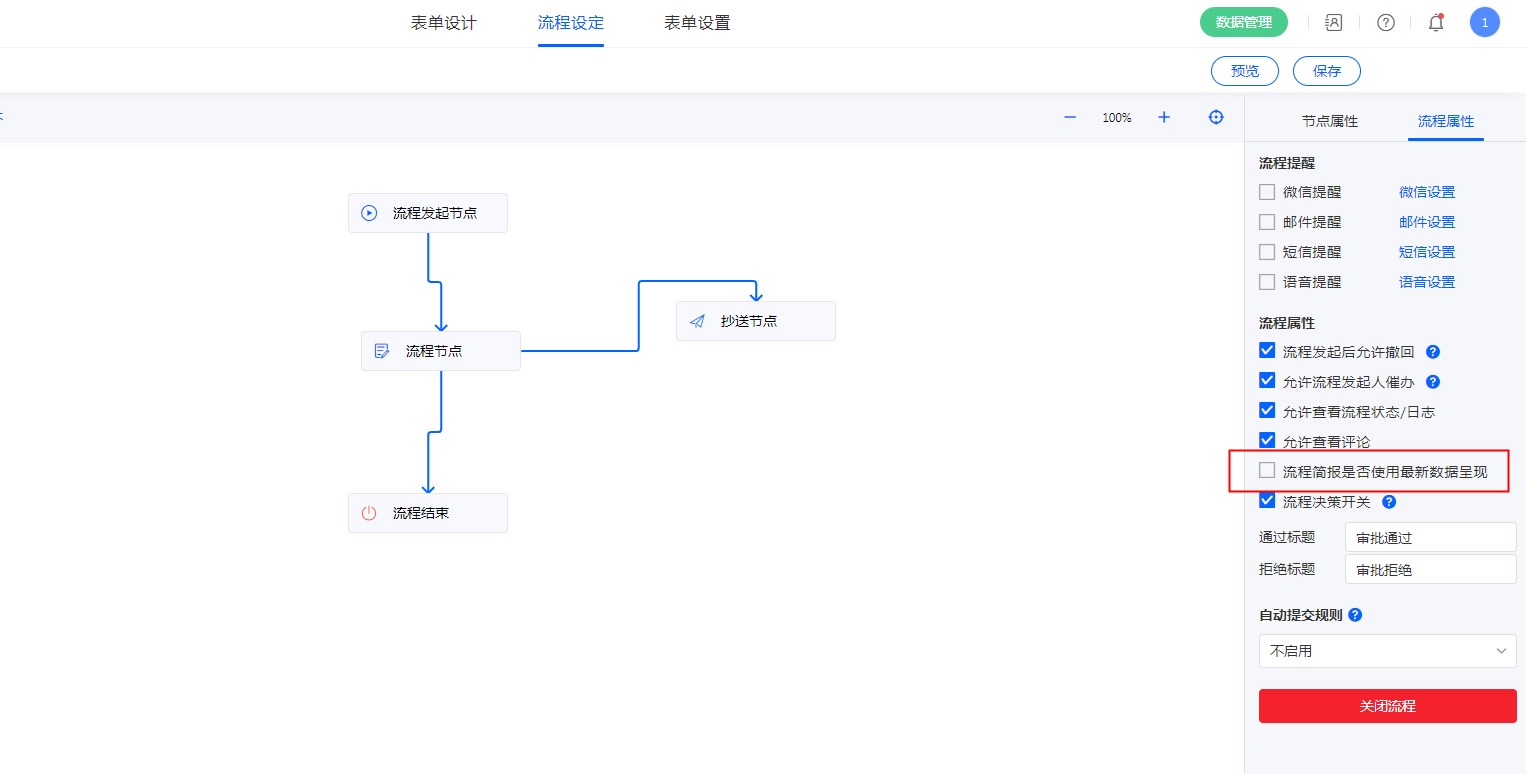 勾选后流程简报使用最新字段及字段值,不勾选则使用最先收到任务时的数据,不会更新。