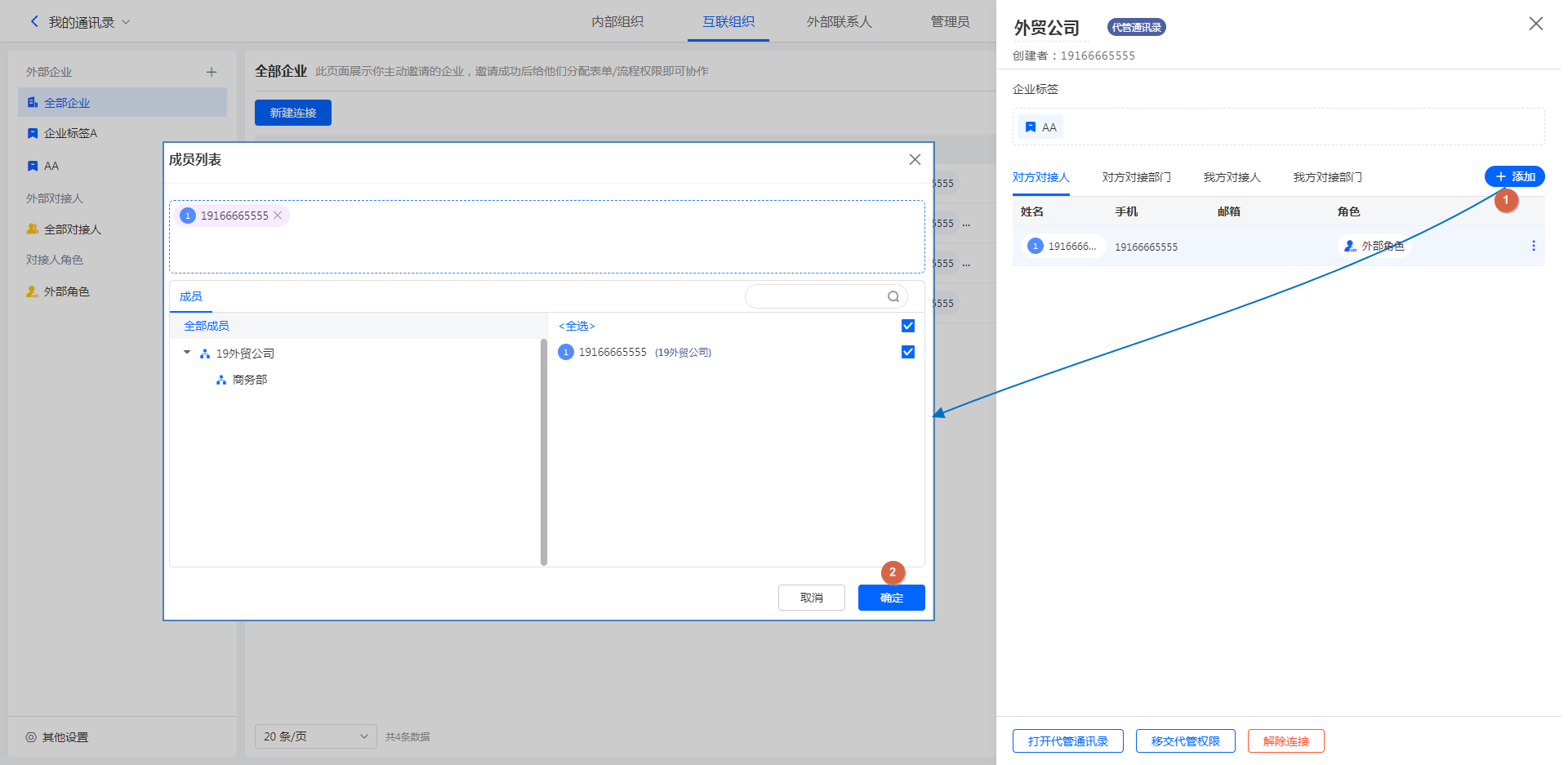 需要哪个外部成员参与到我方企业的业务协作中,就需要联系外部企业设置该成员作为对接人。