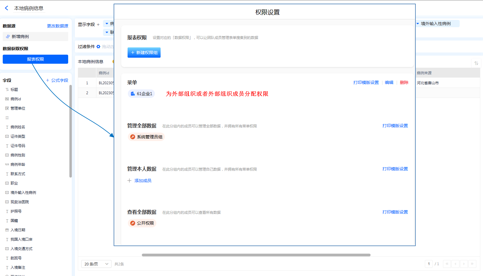 第一步:进入单个图表的设计页面 >> 报表权限,在权限组下设置互联组织的成员或部门。