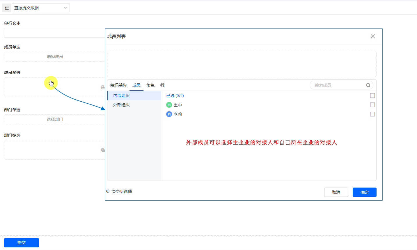 但表单中设计了成员或部门字段时,那么在设计或者使用表单时,可以选择互联组织或成员。