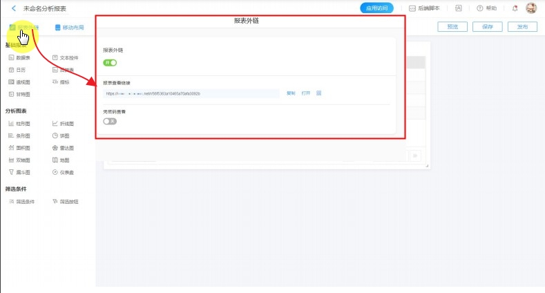 - 开启报表外链:开启后,可以获取到链接,通过此链接可以访问报表。