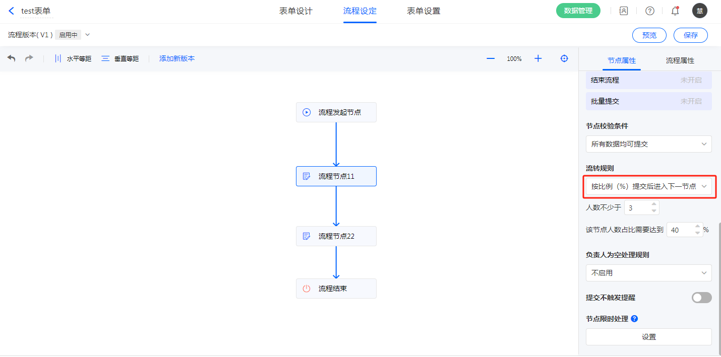 节点选择按比例后,会同时校验 人数 和 人数比例,当两则满足,进入下一个节点,不满足会停留在当前节点,等待下一个人审批。当审批的真实人数少于设置的人数时,流转失败,失败原因写入流程日志。