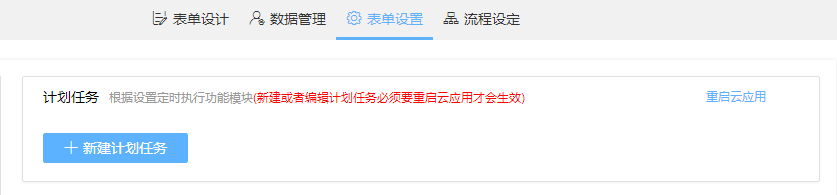 模块计划任务事件:此事件会在我们在表单设置里添加的计划执行时被触发,一个云应用仅有一个后台线程执行计划任务,一个用户下的全部任务数量默认上限为5个(注意:计划任务代码中禁止写死循环代码,否则会造成后续的任务无法执行)