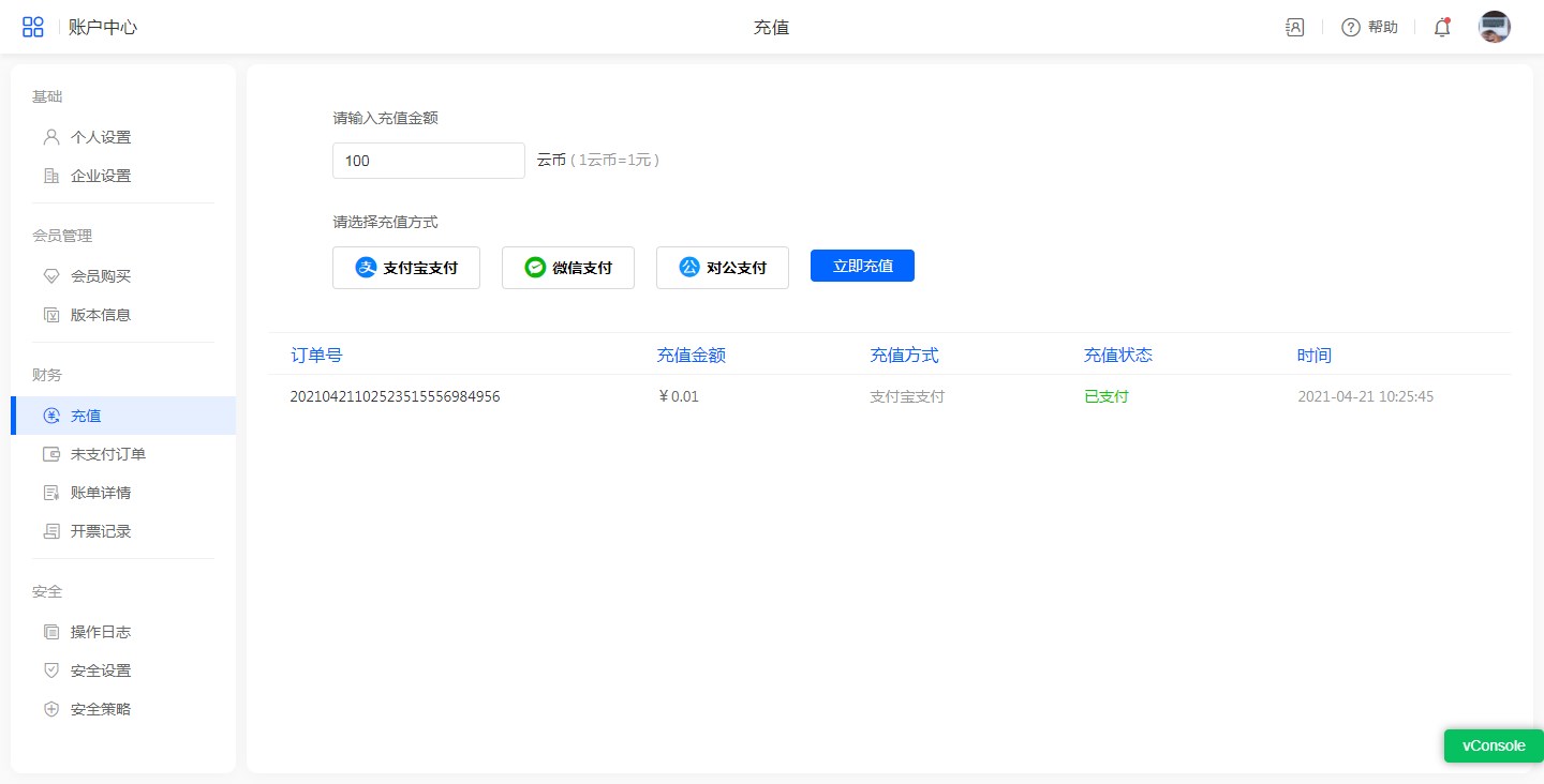 充值即进行账户余额充值,饰配汇的消费均是云币,充值的方式支持支付宝、微信、对公支付这三种。