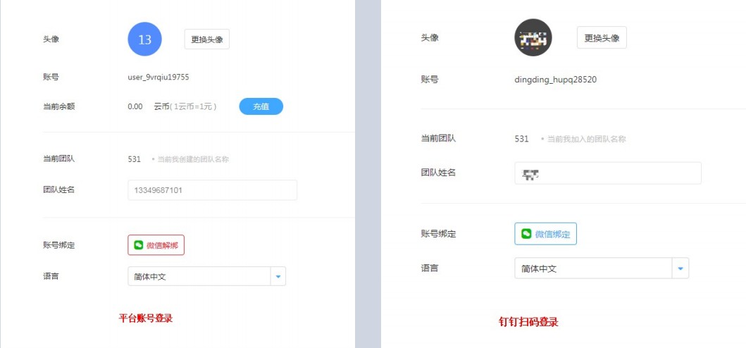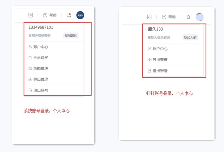 饰配汇账号和钉钉扫码登录系统,在个人中心的功能不一致。
