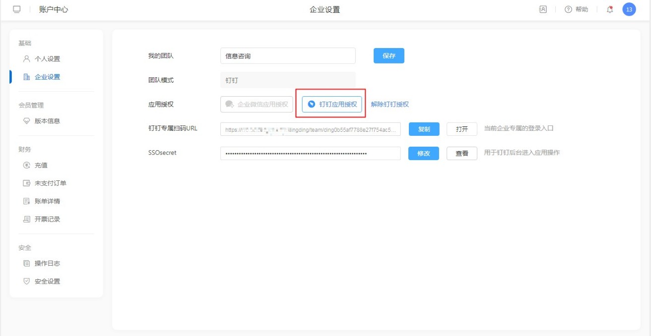 用户通过饰配汇账号登录系统后,进入【右侧头像】-【账号中心】-【企业设置】,在企业设置中可以进行钉钉应用授权。