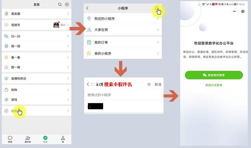 饰配汇支持微信小程序上使用,在微信后台小程序中搜索饰配汇,使用微信授权登录或者饰配汇账户密码登录,登录成功后进入饰配汇系统。