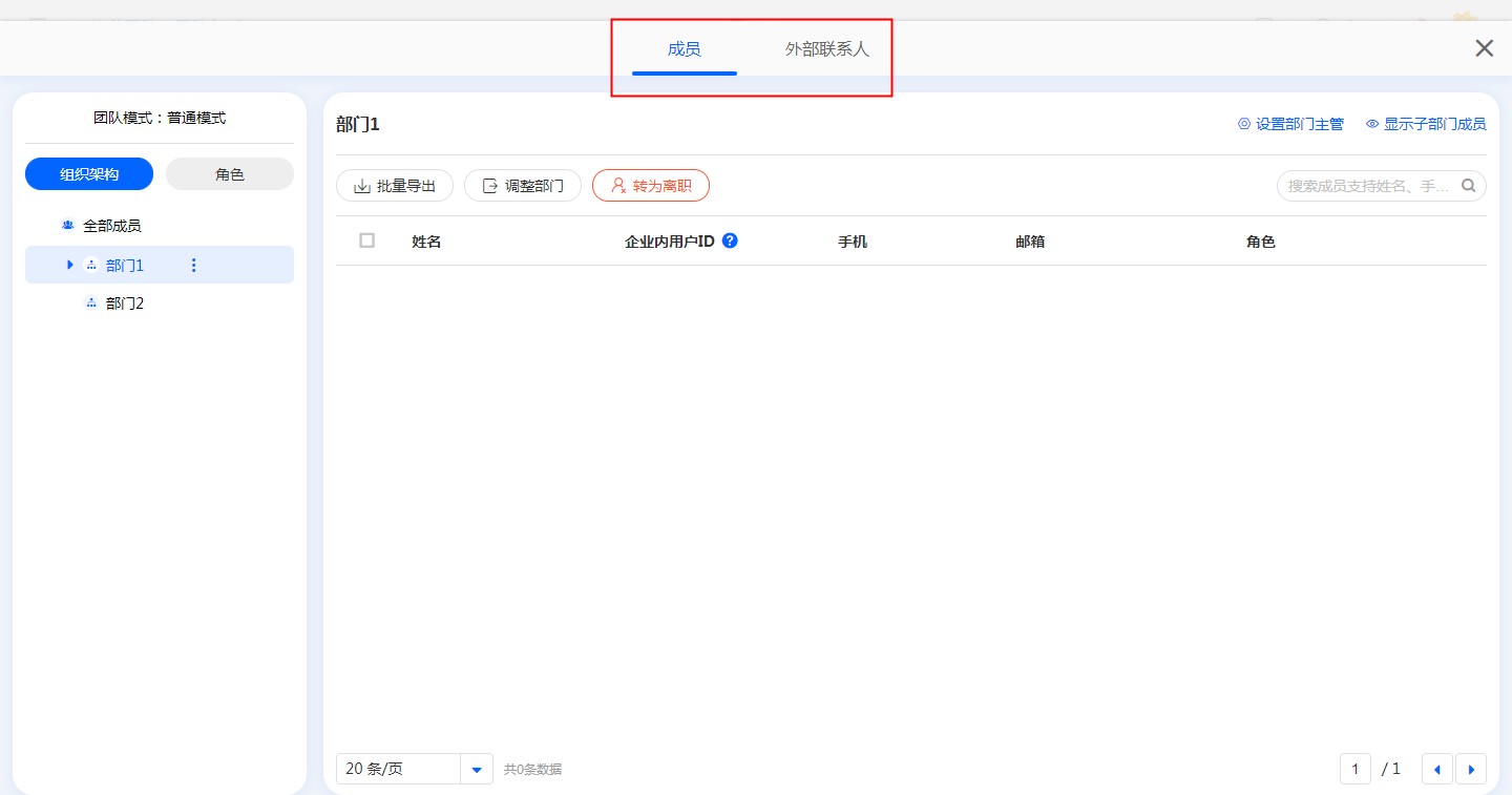 - 当外部联系人作为子管理员时,不能管理通讯录内部成员和部门,因此其成员面板不可见。