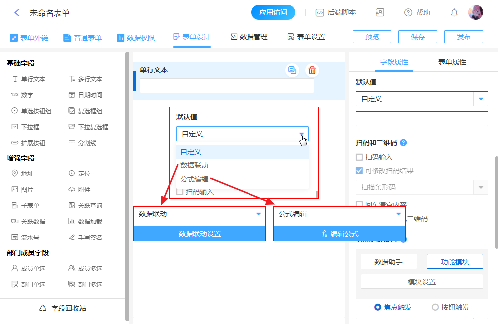 | 数据联动 | 即单行文本的值是根据某个字段从另一个表单中调用过来的。 |