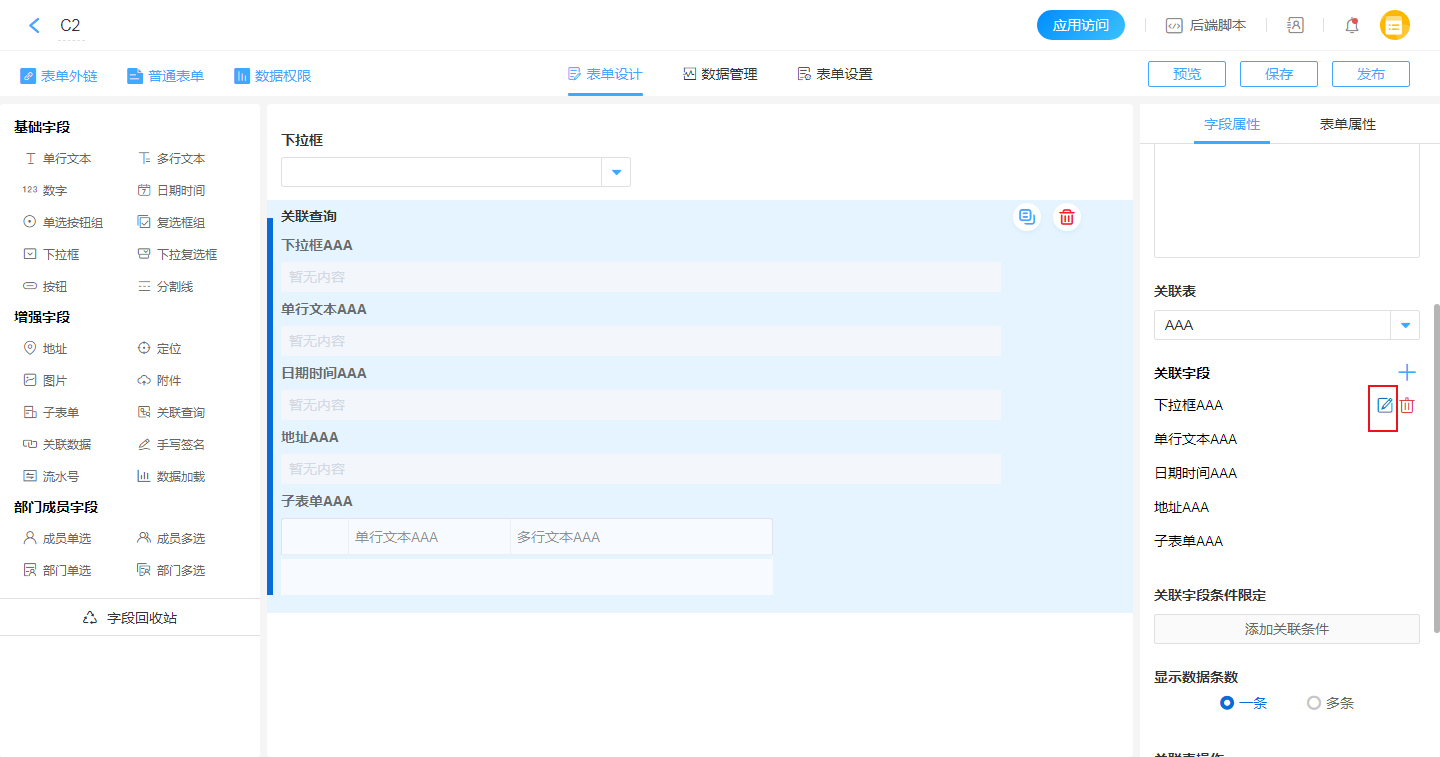 编辑关联字段:点击关联字段的编辑按钮,可以修改字段的显示名称,此名称仅在当前表单展示时生效。