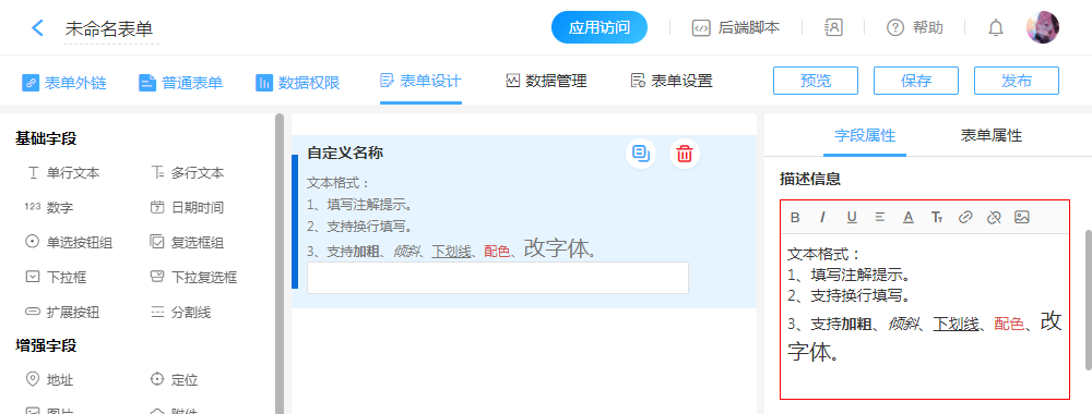 | 文本格式 | 加粗、倾斜、下划线、字体颜色、字体大小。 |