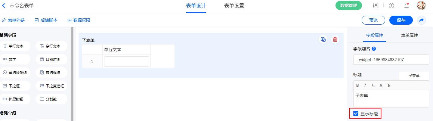 - 子表单内字段的控件属性设置,与普通字段一样,设置后记得保存。