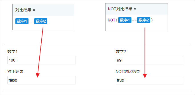 NOT(数字1==数字2) true 反向(数字1等于数字2):成立