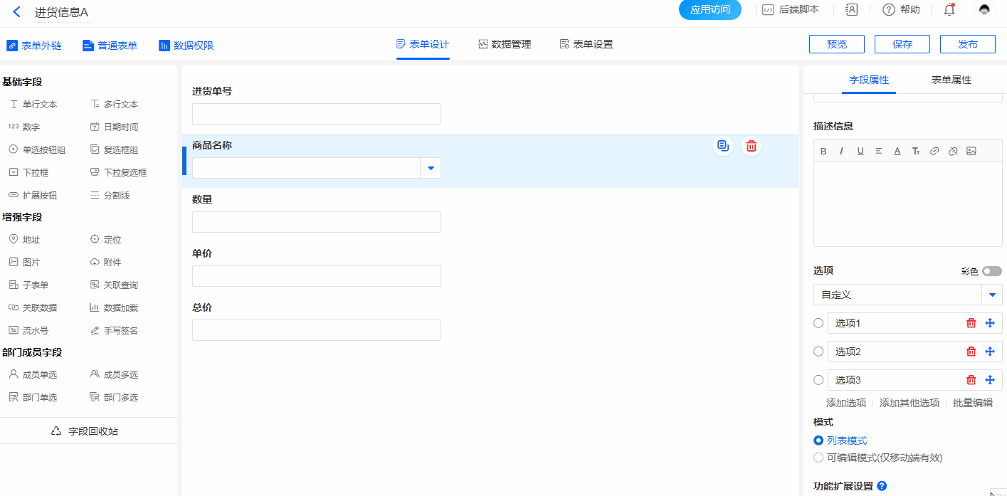 如:A表为商品信息表,B表为进货表,B表的进货商品名称设置了“关联其他表单数据”,那么A表中的商品名称数据就直接作为B表进货商品名称的选项了。