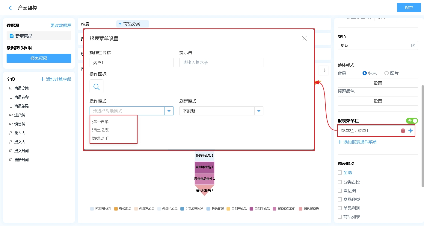 报表菜单 支持 弹出表单、弹出报表、数据助手