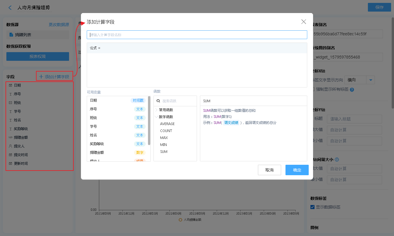 也可以通过增加公式字段,对报表中显示的内容进行简单的计算处理【支持绝大多数数学函数及+-*/四则运算】。