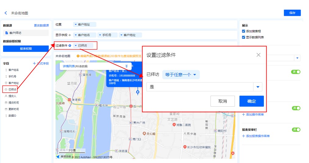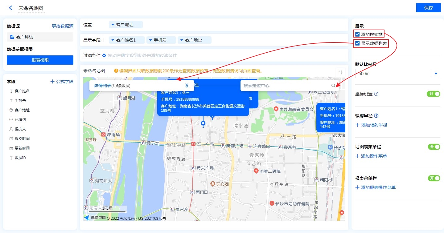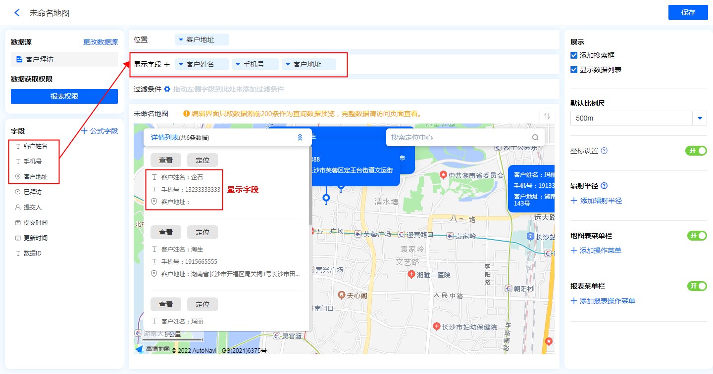 - 地图标识功能:显示字段勾选地图标识功能后,地图的位置标记处会显示该字段信息。