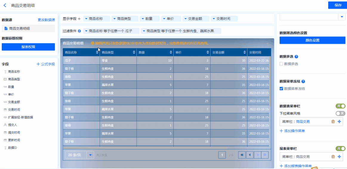 | 日期时间 | 等于、不等于、大于、大于等于、小于、小于等于、选择范围(自定义起始结束时间)、为空、不为空 | 固定值、今天、昨天、本周、上周、本月、上月、今年、过去七天 | |