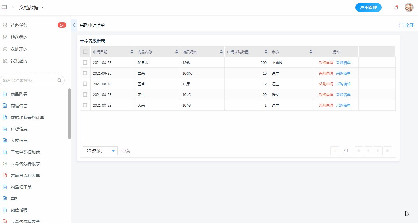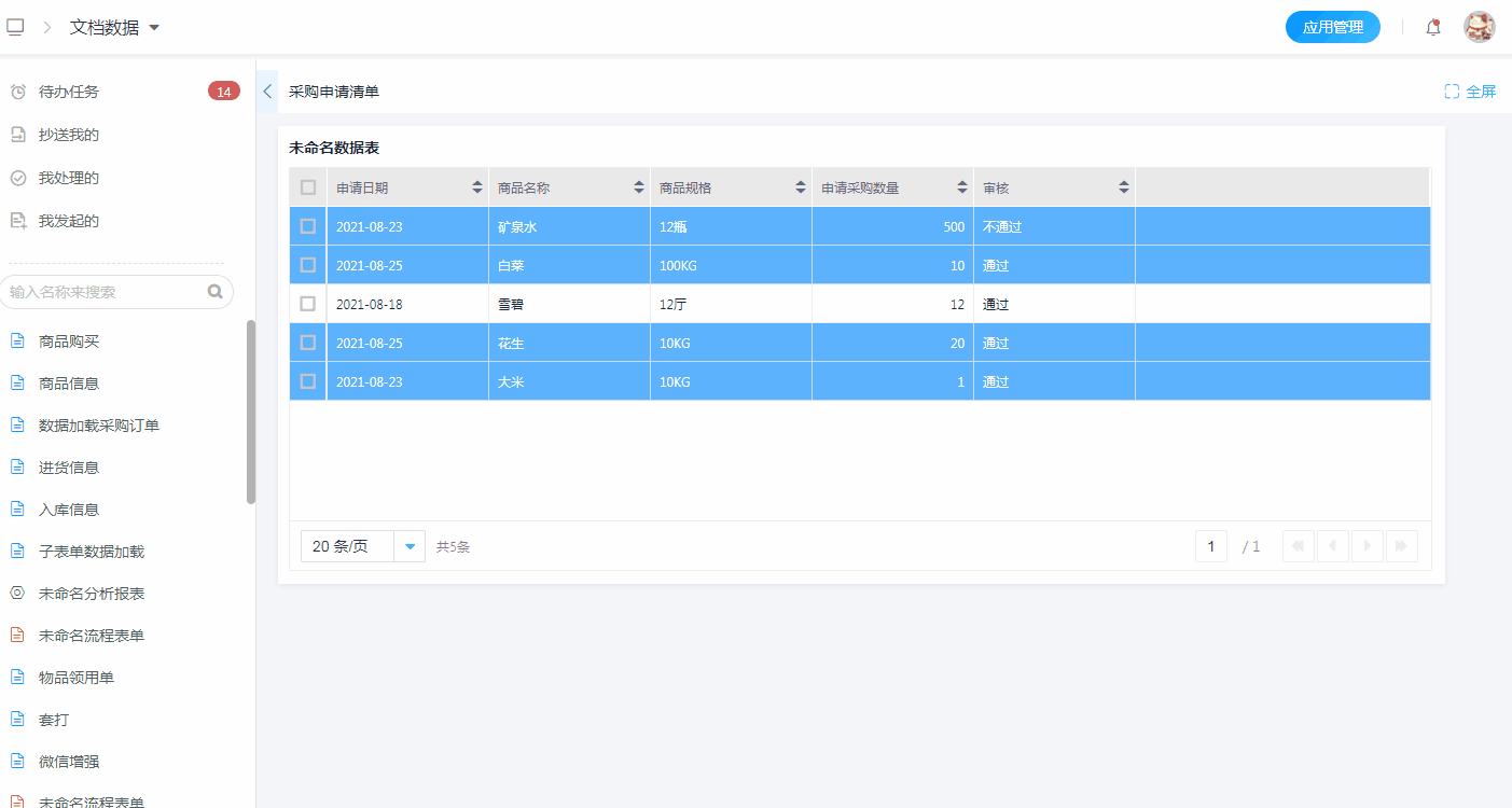 本章主要以采购为例,员工提交采购申请,领导可在报表查看具体的申请明细,并可选择多条采购申请数据分配给相应的人进行采购,申请明细会写入采购清单的子表单中。