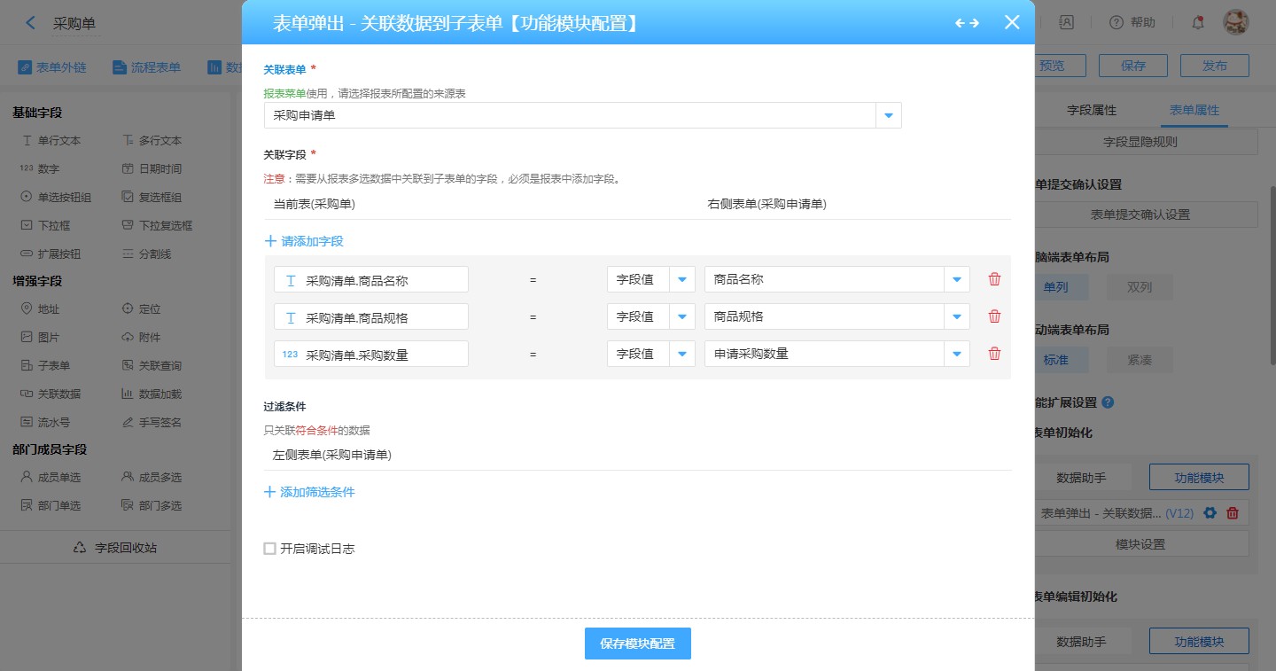 注意:此表单在【表单属性】——【表单初始化】安装了一个功能插件,用于将【采购申请单】中的数据写入到【采购单】的子表单中,配置图如下: