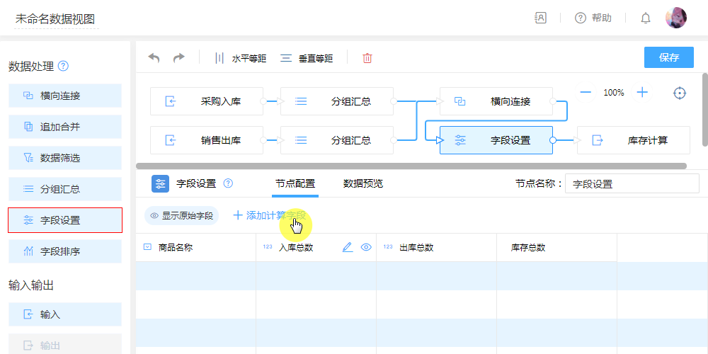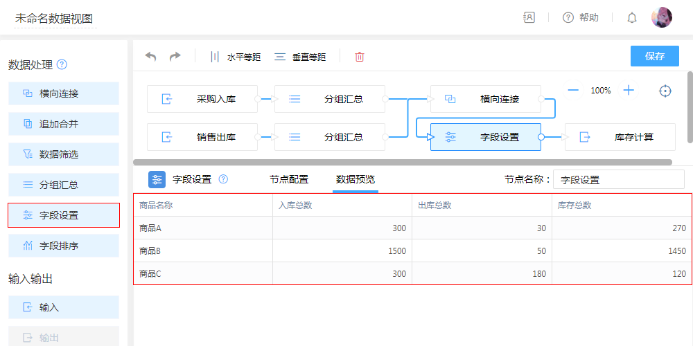 - 配置:横向连接,以“商品”为连接字段,把出入两表数据进行横向拼接,把“入库”与“出库”数据横向拼接为一张表。