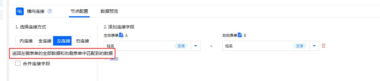 全连接:根据“连接字段”为条件匹配“表单A”与“表单B”,将两边表单数据全部展示。