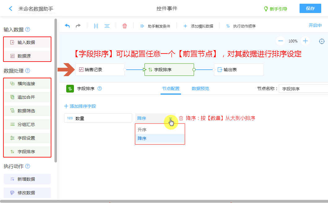 可以对数值字段,进行升降排序;如是文本则按ascii编码进行排序。