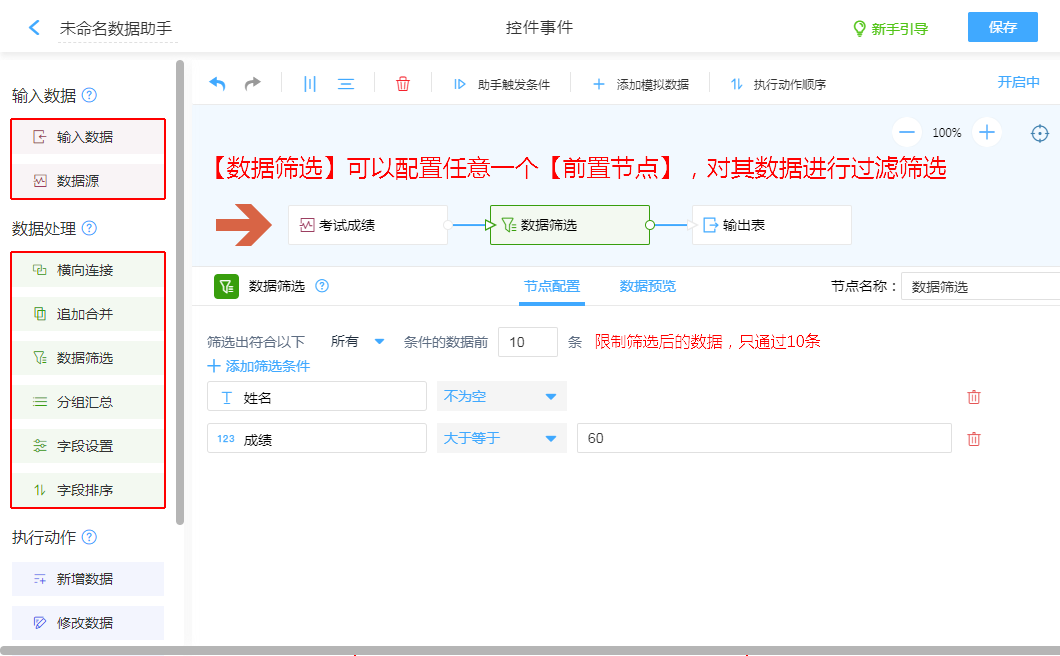 根据配置条件筛选后,只允许符合条件的数据通过。