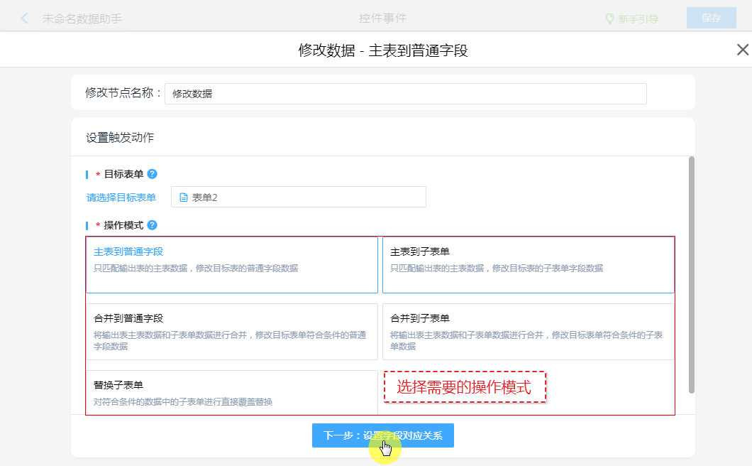 创建“修改数据”动作节点,将“输出表”的数据更新至其他表单。